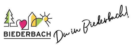 Logo der Gemeinde Biederbach mit grünem Tannenbaum, rotem Herz, gelbem Haus, grünem Hügel und gelber Sonne sowie Schriftzug Du in Biederbach