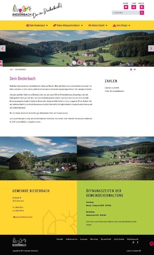 Auf jeder Seite steht ganz unten der Kontakt zum Rathaus Biederbach und die Öffnungszeiten.